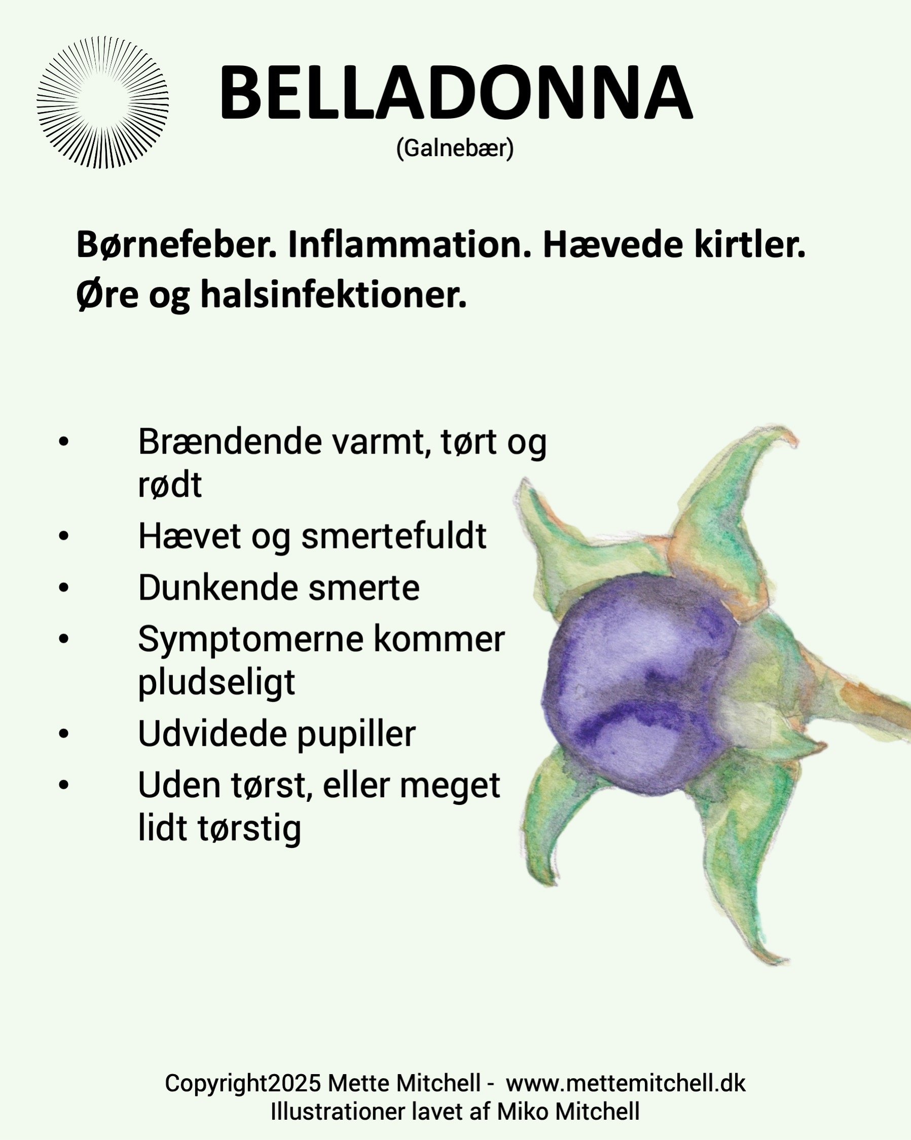 Pludselig og voldsom inflammation og/ eller feber. Dunkende og pulserende smerte. Rødme, brændende og udstrålende varme, der også føles varmt ved berøring. Frygtindgydende feberhallucinationer, der endda kan føre til voldelig adfærd. Ekstrem følsomhed overfor berøring, lyd, lys og larm. Belladonna symptomer forefindes tidligt i infektionstilstande. Symptomerne kommer hurtigt og det påvirkede område er meget rødt og er ekstremt følsomt overfor berøring. Pas på, hvis du skal kigge patienten i halsen eller i ørerne, da selv en lille bevægelse kan udløse en voldsom reaktion. Ofte føles en dunkende puls i det smertefulde område. Patienten er opkogt i ansigtet og har udvidede pupiller. Patienten føler sig svimmel eller som i en vildelse. Brug dette lægemiddel, hvor de beskrevne symptomer er til stede, og hvor der er fare for infektion. Hvis dette lægemiddel gives på det rigtige tidspunkt, kan man undgå at infektion udvikles. Og hvis infektionen bliver betændt, så er det for sent med belladonna, og du skal kigge på andre lægemidler, som hepar sulph eller mercurius. Brug til voldsomme blødninger med meget rødt og varmt blod, der næsten føles som vand. Brug desuden til brystsymptomer, som opstår i forbindelse med amning, som passer på ovenstående beskrivelse. Huden er tør og varm, og ofte opleves symptomerne mest i højre side. Man får det værre ved 3-tiden om eftermiddagen. Tilstanden opstår pludseligt. Mulig årsag til tilstanden: At have fået kulde i hovedet eller for megen varme, f.eks. solstik. Ikke særligt tørstig men har dog lyst til lemonade.